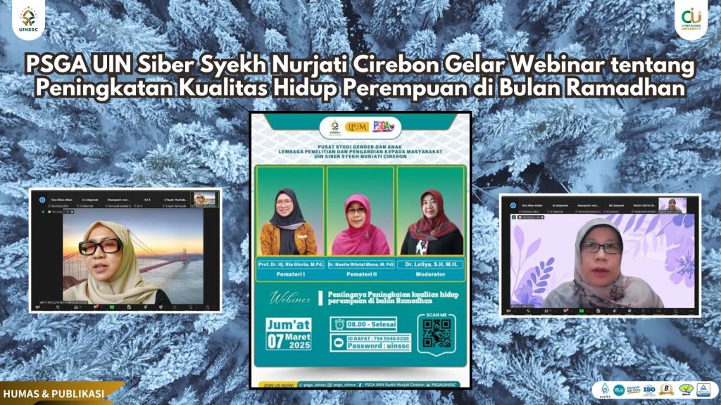UIN Siber Cirebon – Pusat Studi Gender dan Anak (PSGA) Lembaga Penelitian dan Pengabdian kepada Masyarakat (LP2M) UIN Siber Syekh Nurjati Cirebon, yang juga dikenal dengan Cyber Islamic University (CIU), sukses menggelar webinar bertajuk Pentingnya Peningkatan Kualitas Hidup Perempuan di Bulan Ramadhan. Acara ini berlangsung pada Jumat, 7 Maret 2025, melalui platform Zoom Meeting dan bertujuan untuk meningkatkan kesadaran akan peran perempuan dalam keluarga dan masyarakat serta upaya yang dapat dilakukan guna meningkatkan kualitas hidup mereka.