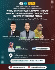 UIN Siber Cirebon – Universitas Islam Negeri (UIN) Siber Syekh Nurjati Cirebon kembali menunjukkan komitmennya dalam memperkuat budaya riset dengan menggelar Workshop “Peran Riset Berdampak terhadap Peningkatan World University Ranking (WUR)”. Kegiatan yang berlangsung di Ruang Konferensi Gedung Siber lantai 4 melalui Zoom Meeting ini menghadirkan jajaran Pusat Pembiayaan Pendidikan Agama dan Pendidikan Keagamaan (Puspenma) Sekretariat Jenderal Kementerian Agama RI. (17/09).
