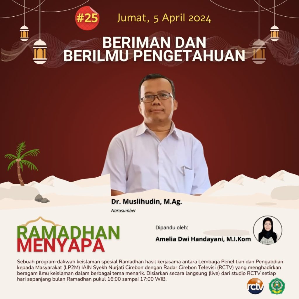 IAIN Cirebon – Program “Ramadhan Menyapa” memasuki hari ke-25 dengan semangat yang tak berkurang. Kerjasama antara Lembaga Penelitian dan Pengabdian kepada Masyarakat (LP2M) IAIN Syekh Nurjati Cirebon dengan Radar Cirebon Televisi (RCTV) kembali menghadirkan momen inspiratif bagi masyarakat, kali ini dengan tema “Beriman dan Berilmu Pengetahuan”. Jum’at, (05/04/2024).