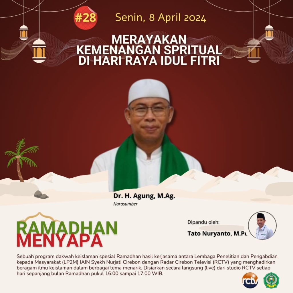 IAIN Cirebon – Pada hari kedua puluh delapan, Senin, 08 April 2024, program “Ramadhan Menyapa” mengajak penonton untuk merenung dan merayakan kemenangan spiritual di Hari Raya Idul Fitri. Kegiatan ini merupakan hasil kerja sama antara Lembaga Penelitian dan Pengabdian kepada Masyarakat (LP2M) IAIN Syekh Nurjati Cirebon dengan Radar Cirebon Televisi (RCTV).
