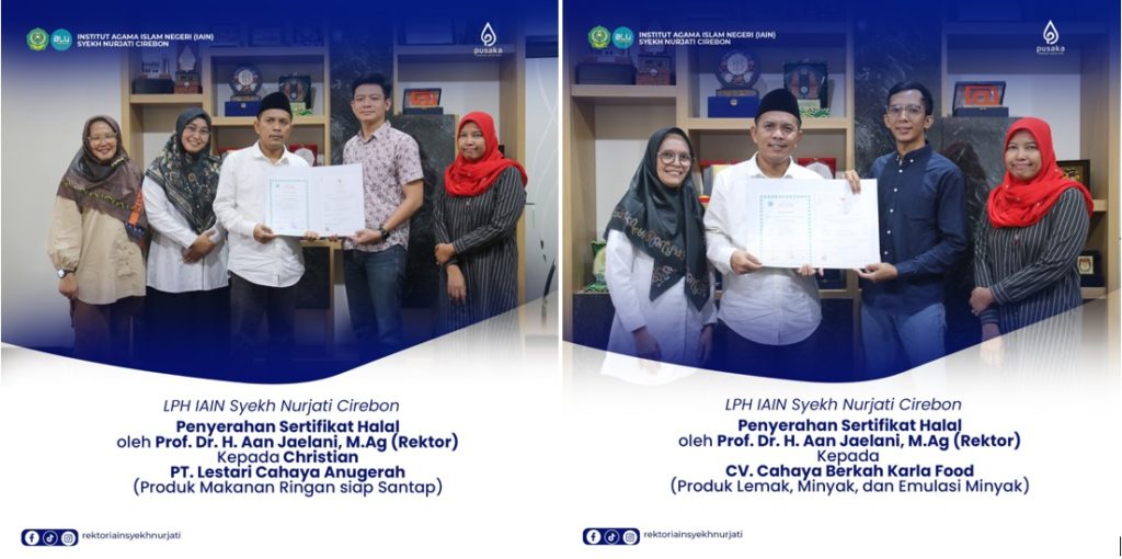 IAIN Cirebon – Momentum penting bagi dunia usaha halal kembali terjadi di Kota Cirebon. Rektor IAIN Syekh Nurjati, Prof. Dr. H. Aan Jaelani, M.Ag, bersama Ketua Lembaga Penjaminan Halal (LPH) IAIN Syekh Nurjati, Mariyah Ulfah, M.E.Sy., hari ini secara resmi menyerahkan Sertifikat Halal kepada PT Lestari Cahaya Anugrah dan CV Cahaya Berkah Karlafood. Senin, (25/03/2024).