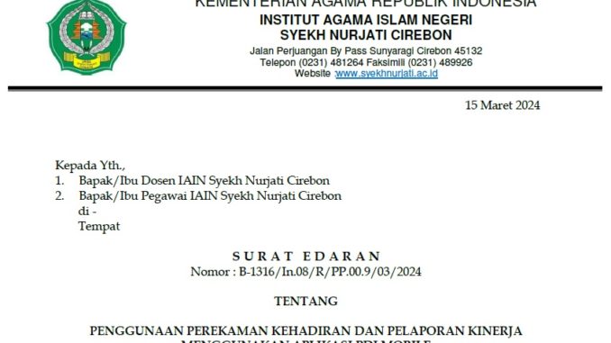 SURAT EDARAN PENGGUNAAN PEREKAMAN KEHADIRAN DAN PELAPORAN KINERJA MENGGUNAKAN APLIKASI PDJ MOBILE DI LINGKUNGAN IAIN SYEKH NURJATI CIREBON 18 Maret 2024 arifin Berita, Informasi 0 Untuk Informasi Selengkapnya Silahkan Download Link Dibawah ini : B-1316_Surat Edaran Penggunaan Aplikasi PDJ Mobile #uinssciaincireboniainsyekhnurjaticirebon