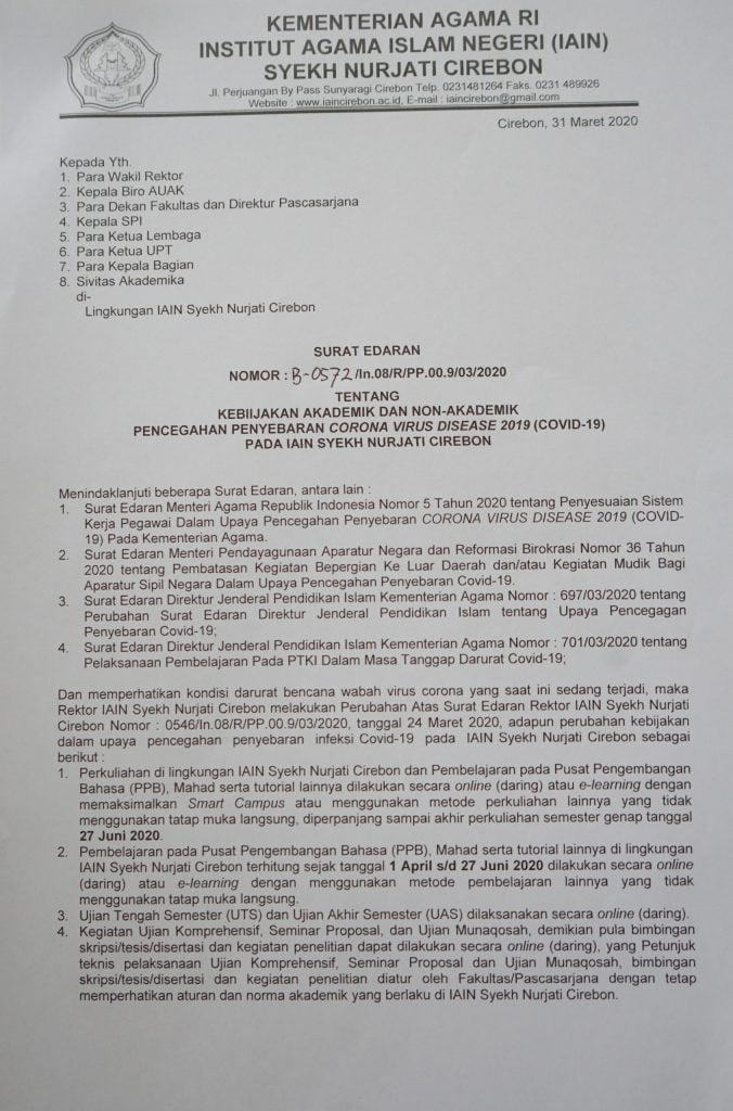 Dan memperhatikan kondisi darurat bencana wabah virus corona yang saat ini sedang terjadi, maka Rektor IAIN Syekh Nurjati Cirebon melakukan Perubahan Atas Surat Edaran Rektor IAIN Syekh Nurjati Cirebon Nomor : 0546/In.08/R/PP.00.9/03/2020, tanggal 24 Maret 2020, adapun perubahan kebijakan dalam upaya pencegahan penyebaran infeksi Covid-19 pada IAIN Syekh Nurjati Cirebon sebagai berikut :