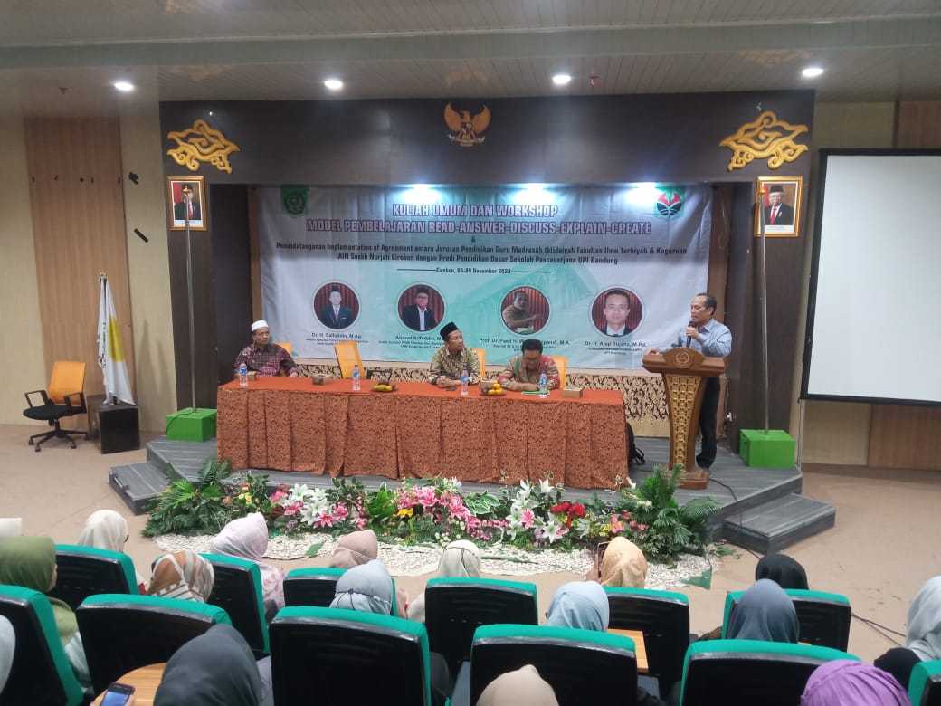 IAIN Cirebon – Jurusan Pendidikan Guru Madrasah Ibtidaiyah (PGMI) di bawah Fakultas Ilmu Tarbiyah dan Keguruan, IAIN Syekh Nurjati Cirebon, menggelar acara Kuliah Umum dan Workshop Model Pembelajaran RADEC. Acara tersebut bukan hanya sebuah kegiatan rutin, namun juga merupakan implementasi dari kerjasama strategis antara PGMI IAIN Syekh Nurjati Cirebon dengan Program Pendidikan Dasar Sekolah Pascasarjana (SPs) Universitas Pendidikan Indonesia (UPI) Bandung. Jum’at, (08/12/2023).