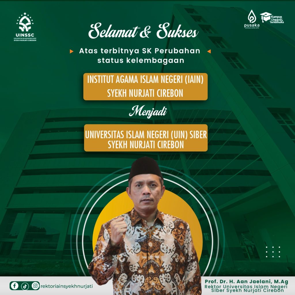 IAIN Syekh Nurjati Cirebon telah bertransformasi secara kelembagaan menjadi Universitas Islam Negeri (UIN) Siber Syekh Nurjati Cirebon berdasarkan Peraturan Presiden RI Nomor 60 Tahun 2024 yang ditandatangani Presiden RI Ir. H. Joko Widodo pada tanggal 21 Mei 2024. Perubahan kelembagaan ini menjadi langkah maju untuk memposisikan perguruan tinggi keagamaan Islam negeri ini menjadi satu-satunya PTKN (Perguruan Tinggi Keagamaan Negeri) berbasis siber di Indonesia. UIN Siber ini menjadi pilot project Kementerian Agama sesuai Keputusan Menteri Agama RI Nomor 860 Tahun 2022.