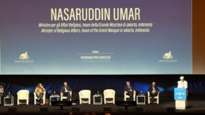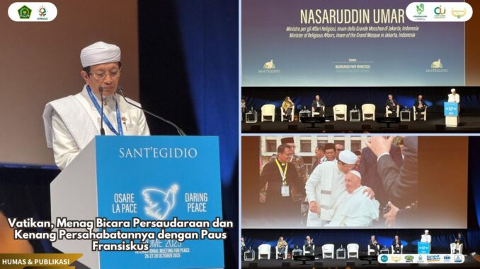 UIN Siber Cirebon (Vatikan) – Menteri Agama Nasaruddin Umar menjadi salah satu pembicara pada Forum Internasional untuk Perdamaian “Daring Peace” di Vatikan – Roma. Di hadapan para tokoh dunia, Menag bicara tentang persaudaraan dan mengenang persahabatannya dengan mendiang Paus Fransiskus. Tepuk tangan tamu undangan sangat panjang di akhir sambutan Imam Besar Masjid Istiqlal.