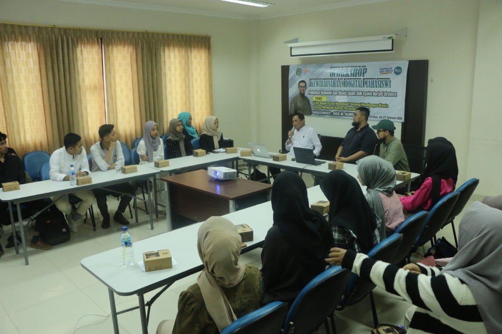 Fakultas Ekonomi dan Bisnis Islam (FEBI) Institut Agama Islam Negeri (IAIN) Syekh Nurjati Cirebon menggelar Workshop Kewirausahaan Digital Mahasiswa dengan mengusung tema “Like Dapat, Cuan Mendekat! Strategi Membangun Bisnis dengan Membuat Konten Personal Branding” dengan menghadirkan narasumber yang berpengalaman yakni Agis, M. Ramdhani (Founder and CEO Holding Musim Indonesia Corporation). Kegiatan dilaksanakan di SBSN FEBI lantai 2 ruang 24 kampus setempat. Senin (26/02/24)